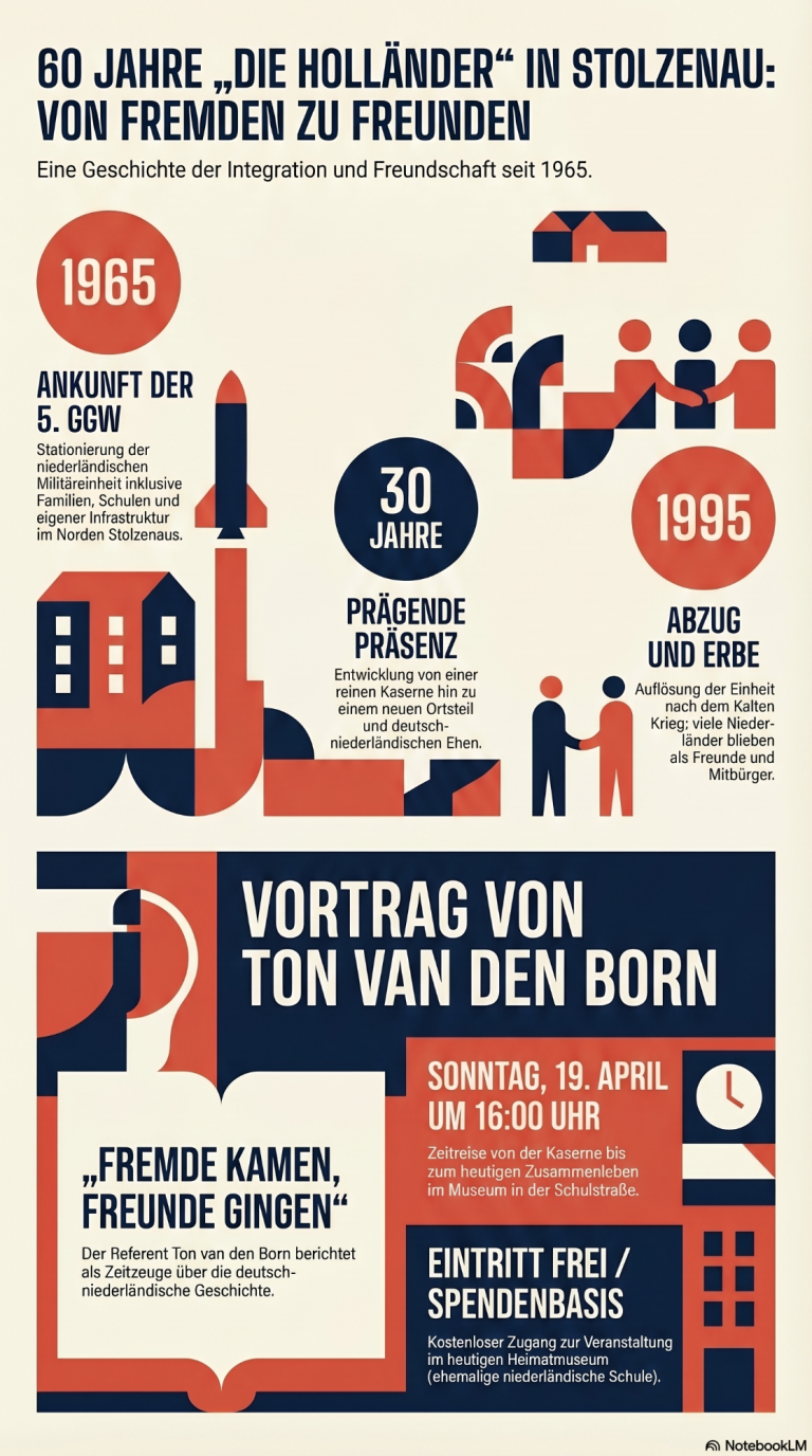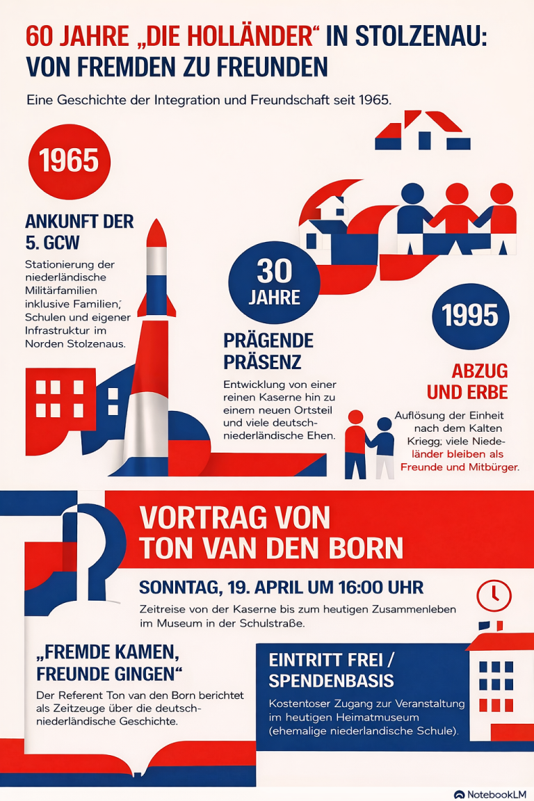 Die Stationierung der niederländischen 5. Gruppe für Lenkwaffen (5. GGW) vor 60 Jahren markierte den Beginn einer drei Jahrzehnte währenden Ära, die das Ortsbild und das soziale Gefüge von Stolzenau nachhaltig prägte. Was als militärische Notwendigkeit des Kalten Krieges begann, entwickelte sich zu einer tiefgreifenden sozialen Integration, bei der aus „Fremden“ geschätzte Mitbürger und Freunde wurden. Die Präsenz der Niederländer manifestierte sich nicht nur in militärischen Anlagen und Kasernen, sondern auch im Bau ganzer Wohngebiete und eigener Bildungseinrichtungen. Mit dem Ende des Kalten Krieges und der Auflösung der Einheit im Jahr 1995 endete die offizielle Stationierung, doch die persönlichen und kulturellen Verbindungen bestehen durch verbliebene Einwohner und deutsch-niederländische Ehen bis heute fort.