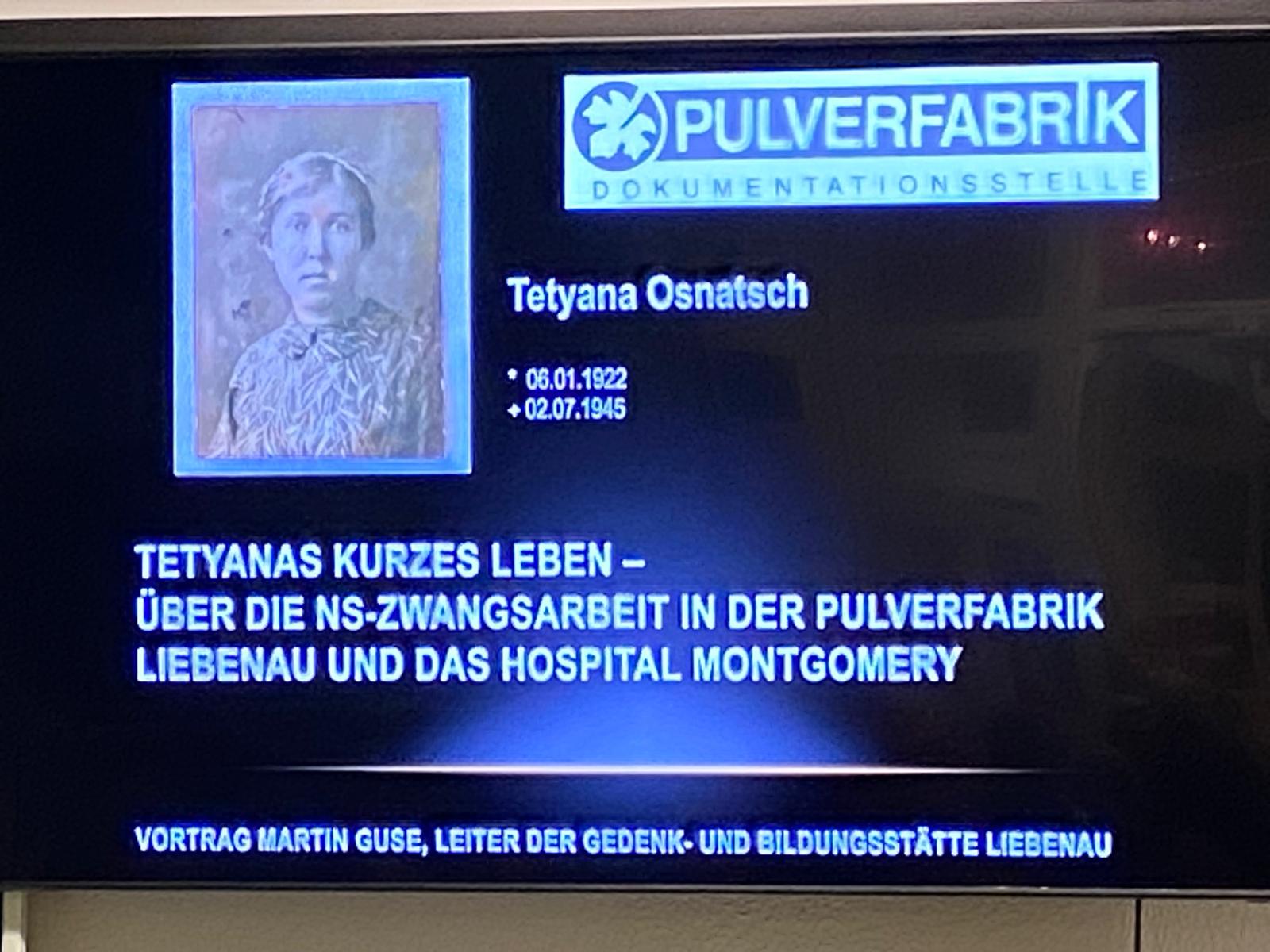 Dokumentationsstelle Pulverfabrik Liebenau e.V. vom Schicksal der 1942 nach Deutschland verschleppten Tetyana Osnatsch. Die Ukrainerin wurde zur Zwangsarbeit gezwungen und verstarb 1945 in Bad Rehburgs Hospital.